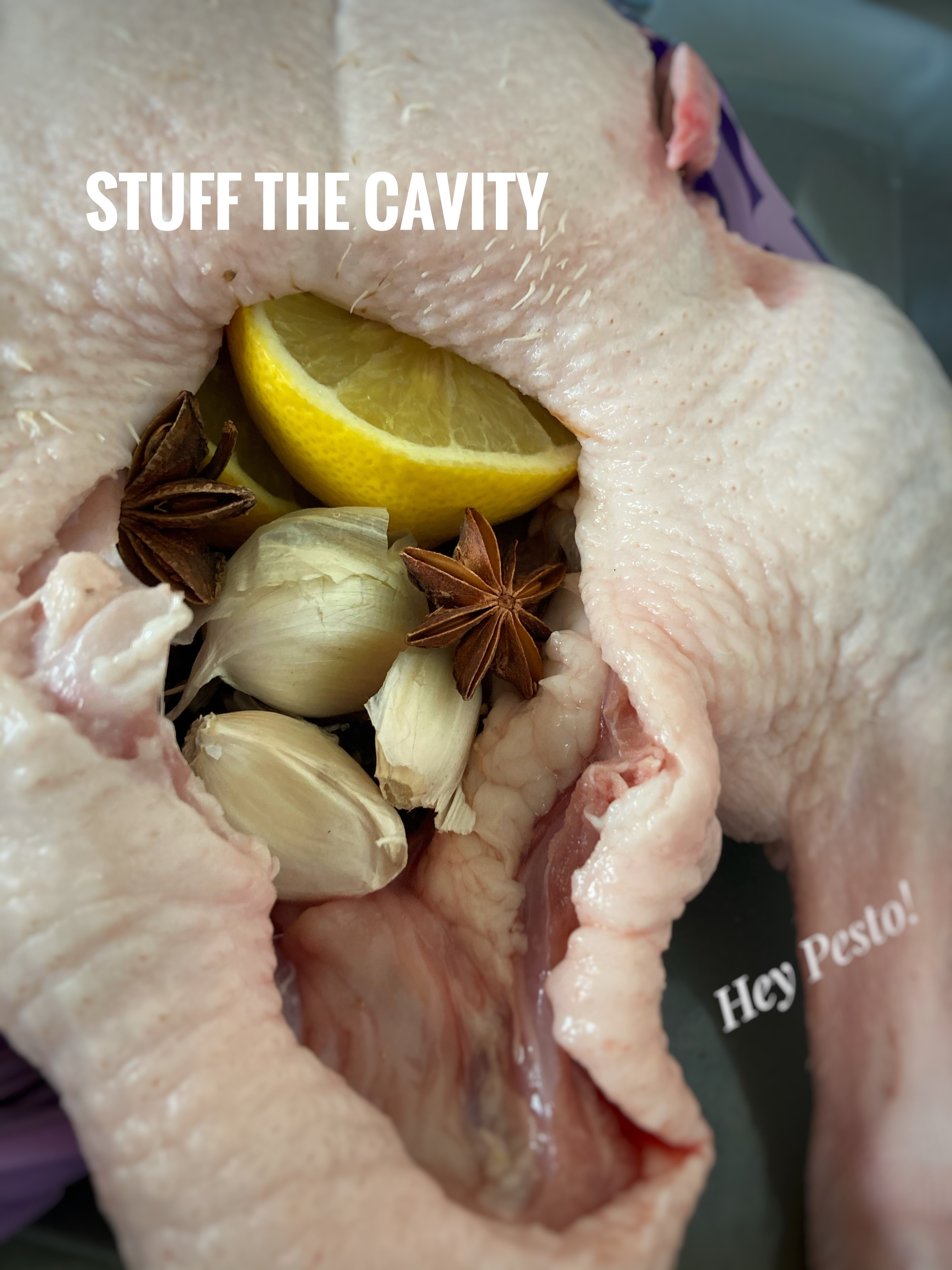 So once the duck was defrosted (overnight in the fridge) and the giblets removed, I stuffed the cavity with lemon, garlic, dried limes and star anise
